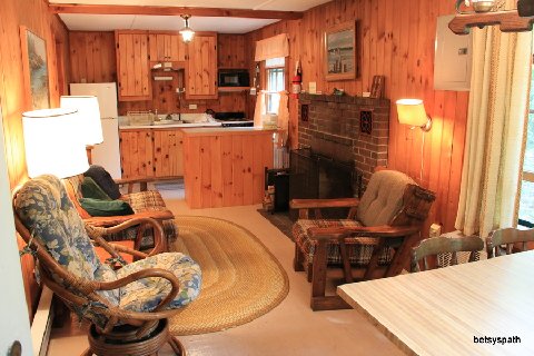 It has a living-dining room with a fireplace, a kitchen, and a bath.